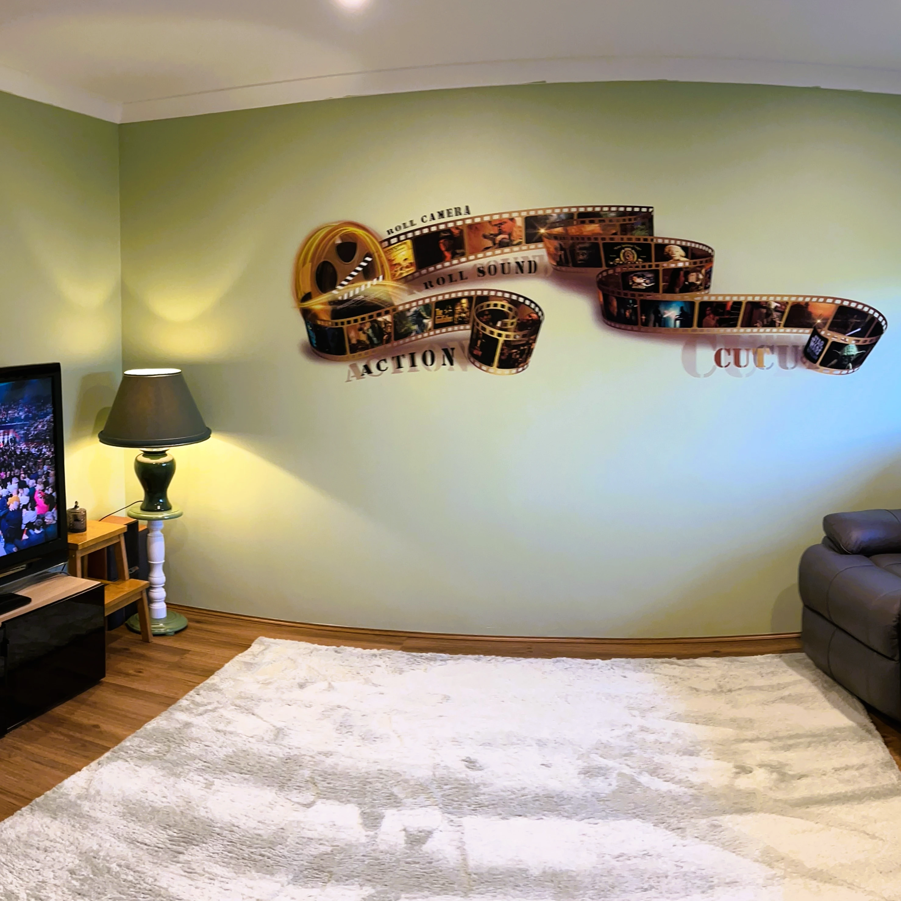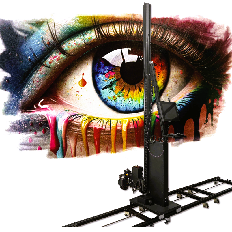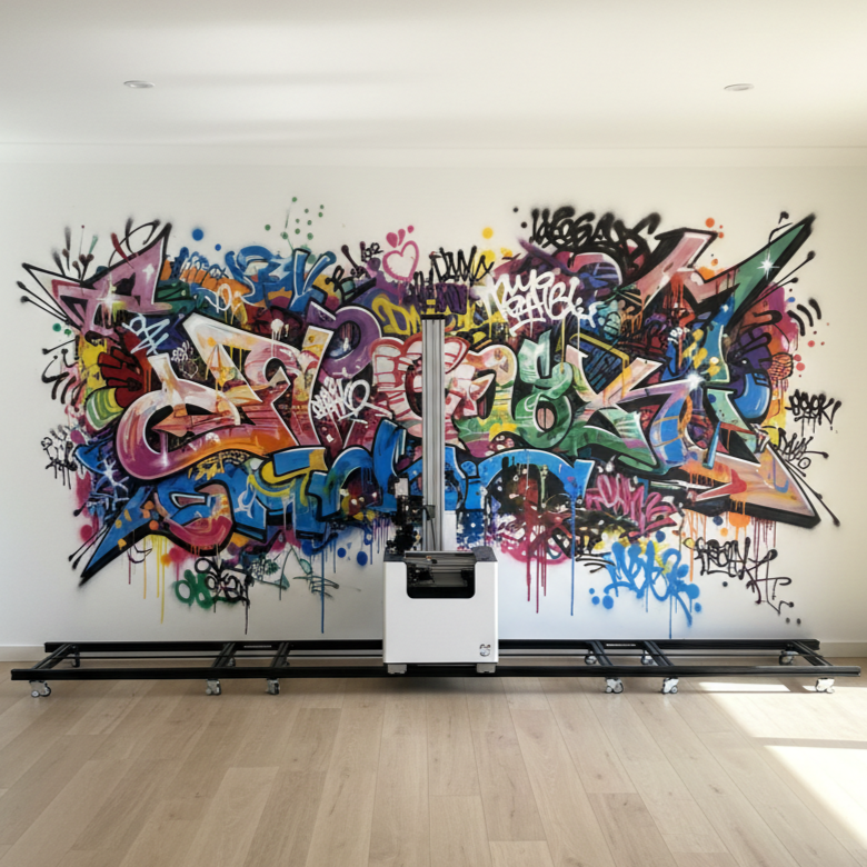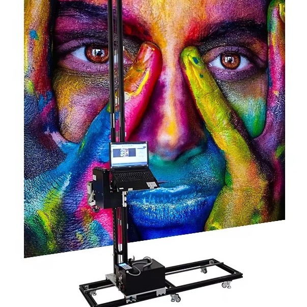 Printer setup is quick and easy: the machine and its tracks require some space to move and print directly to the wall.